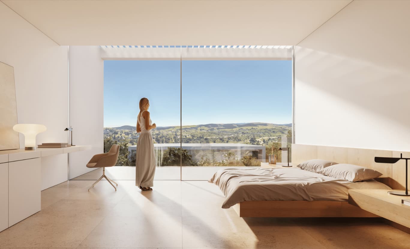La relación del interior con el exterior es una de las cuestiones más importantes del proyecto. Grandes ventanales de alta gama y diseñados con perfilería oculta optimizan la entrada de luz natural y proporcionan continuidad y amplitud al espacio y generan vistas desde cualquiera de las estancias. La iluminación interior también ha sido cuidadosamente elegida para contribuir al bienestar: con un alto índice de reproducción cromática, luces nocturnas activadas por movimiento y sistemas de iluminación circadiana que promueven el sueño reparador.